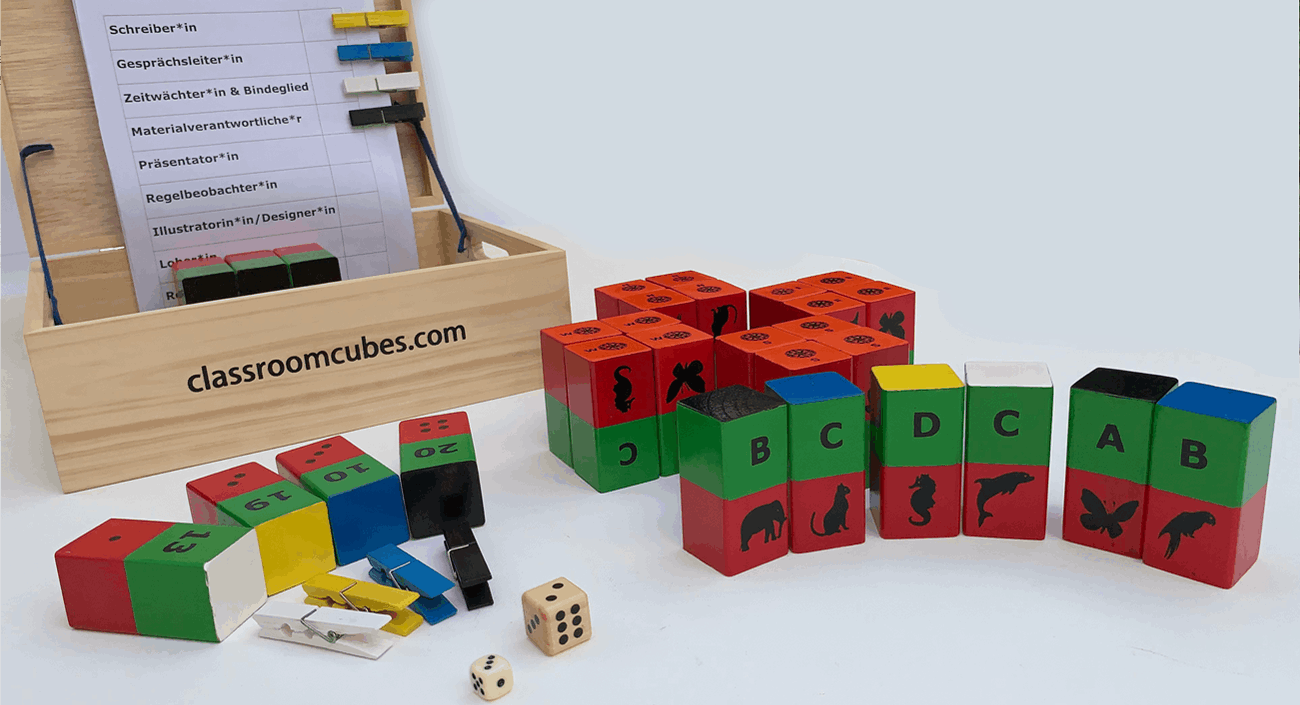 nützliche (wie die meisten) und ziemlich unnütze (wie der Anti-Zombies-Flammenwerfer von Elon Musk). Vor mir liegt eine Holzkiste mit der Aufschrift „CLASSROOMCUBES“. Drin ein Satz farbiger Holzklötze, ein paar farbige Klammern, zwei Würfel und ein Booklet.